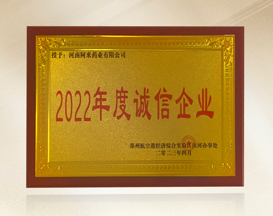 2023年4月,阿來(lái)藥業(yè)被鄭州航空港經(jīng)濟(jì)綜合實(shí)驗(yàn)區(qū)授予“2022年度誠(chéng)信企業(yè)”稱號(hào)