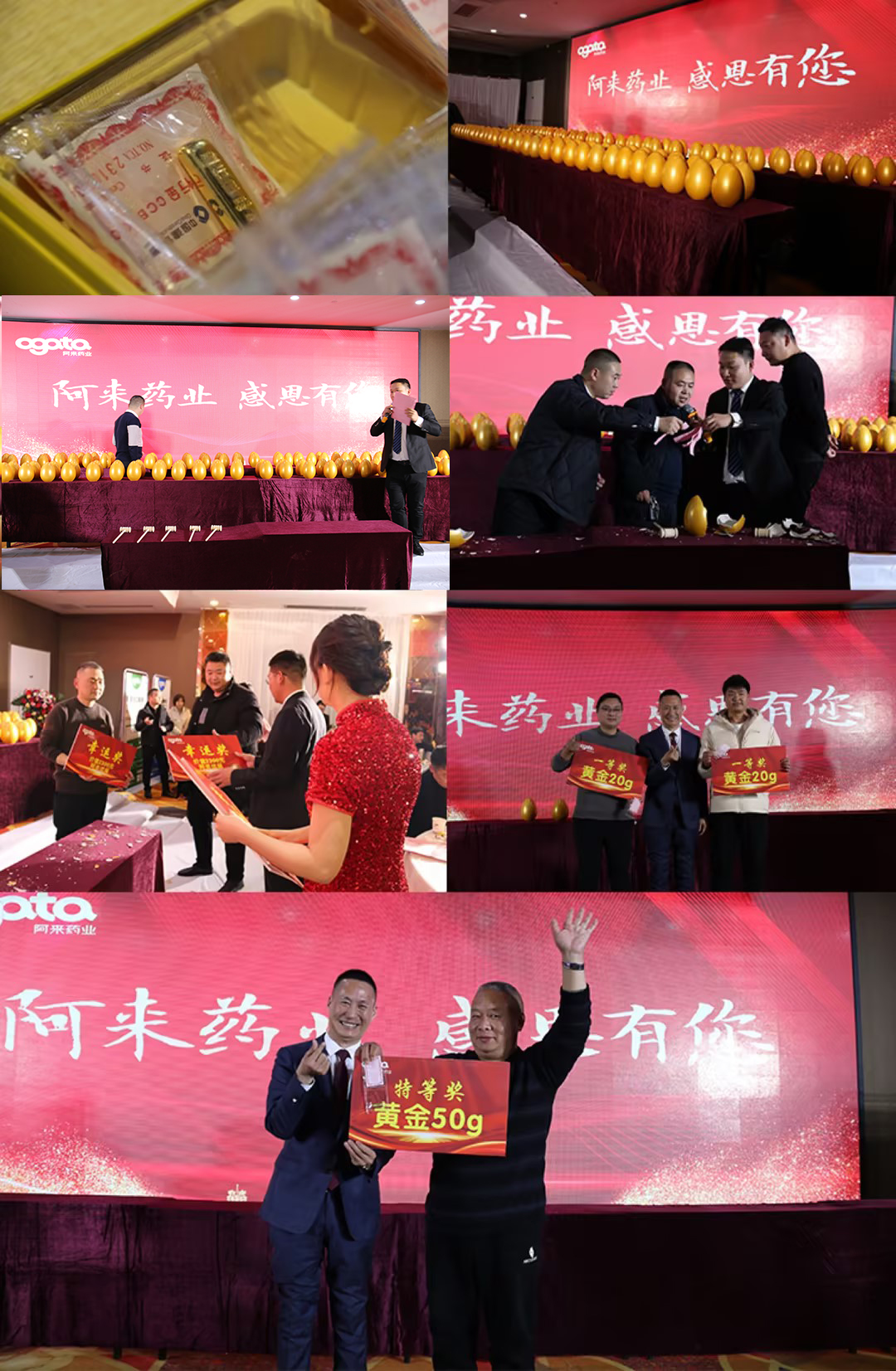 答謝會(huì)現(xiàn)場(chǎng)還舉行了阿來藥業(yè)“香砂養(yǎng)胃丸”新品發(fā)布會(huì),阿來藥業(yè)副總經(jīng)理陳來景詳細(xì)介紹了“香砂養(yǎng)胃丸”的配方、適用癥、用法用量等藥品說明。 隨后,在“藥店經(jīng)營--面診+聯(lián)合用藥”環(huán),專業(yè)藥師向參會(huì)者講述和解答一系列身體基礎(chǔ)問題與中醫(yī)的關(guān)聯(lián)。 好禮不斷,驚喜連連!值此盛宴,為感恩回饋廣大合作伙伴,阿來藥業(yè)精心準(zhǔn)備了“砸金蛋拿50g黃金”等抽獎(jiǎng)活動(dòng),隨著木槌的擊落,121個(gè)金蛋一個(gè)接一個(gè)被砸開花,幸運(yùn)獎(jiǎng)、5g-50g的黃金相繼被砸出。砸金蛋活動(dòng)在激動(dòng)人心、人盡皆歡的氛圍中進(jìn)行,將答謝會(huì)現(xiàn)場(chǎng)氣氛推向了高潮,一塊塊寓意吉祥的黃金禮品、一個(gè)儀式、一次握手、一次合影、一次干杯,鐫刻記錄著阿來與合作伙伴在合作過程中的每一份信任和每一次成功。 好產(chǎn)品,心服務(wù)!阿來藥業(yè)成立于2018年,秉承“為所有合作伙伴提供七星級(jí)服務(wù),讓合作伙伴都滿意”的服務(wù)標(biāo)準(zhǔn),用心做好產(chǎn)品,得到合作伙伴的認(rèn)可、信任和支持。 這一路走來,雖歷經(jīng)風(fēng)雨,但更多的是感恩相隨。腳踏實(shí)地,高效奮斗!參會(huì)合作伙伴們紛紛表示,新的一年,期待與阿來藥業(yè)攜手同行,肩負(fù)醫(yī)藥人的使命和擔(dān)當(dāng),不忘初心,與阿來一起成就美好未來。